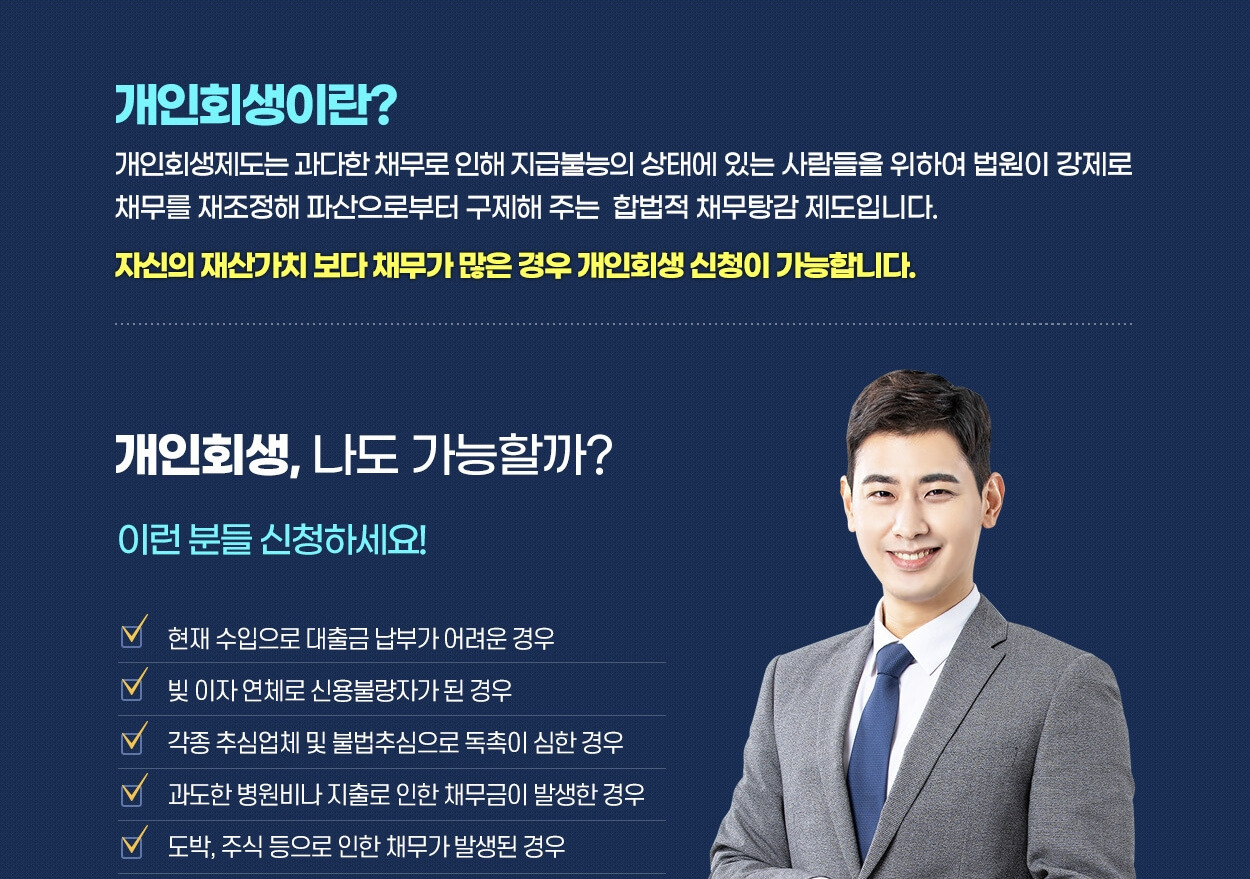 개인회생은 채무자의 경제적 재기를 돕기 위한 제도입니다. 갑작스러운 실직, 의료비 증가, 사업 실패 등으로 인해 경제적 어려움을 겪고 있는 분들에게 안정적인 재정 회복을 위한 해결책이 될 수 있습니다.